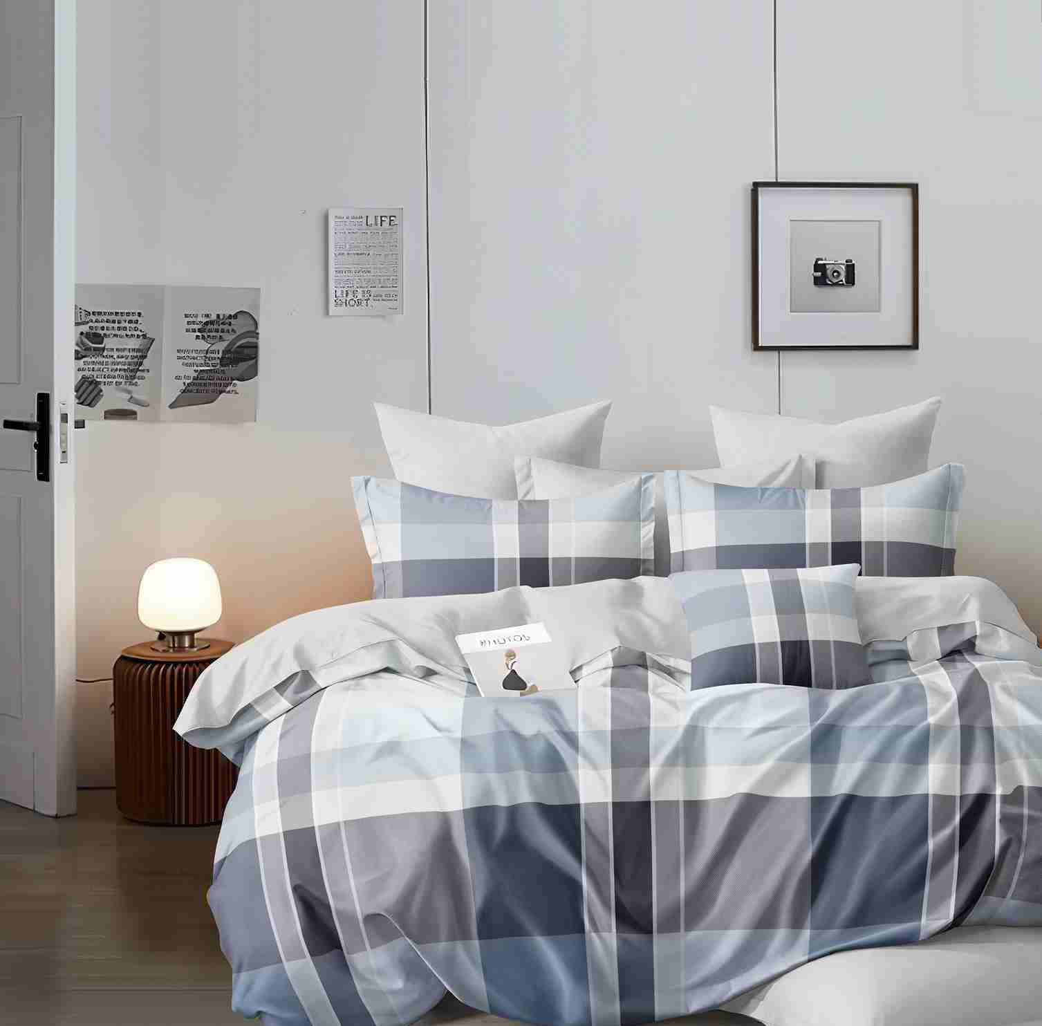 Комплектация: два пододеяльника 145х215 на молнии (основной цвет и компаньон с обратной стороны), простыня 220х240 (цвет - компаньон), две наволочки 50х70 на запАхе (основной цвет), две наволочки 70х70 на запАхе (цвет - компаньон)