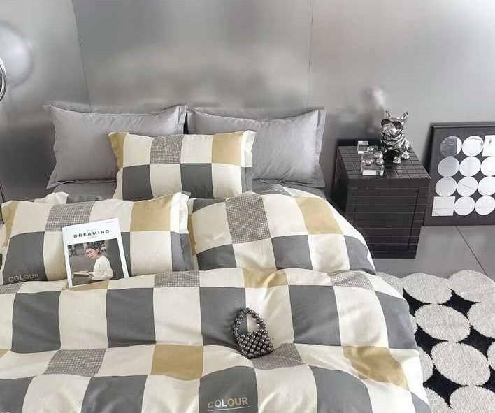 Комплектация: два пододеяльника 145х215 на молнии (основной цвет и компаньон с обратной стороны), простыня 220х240 (цвет - компаньон), две наволочки 50х70 на запАхе (основной цвет), две наволочки 70х70 на запАхе (цвет - компаньон)